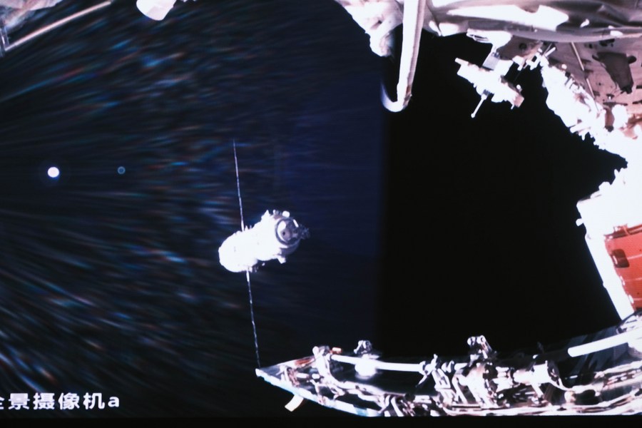 This screen image captured at Beijing Aerospace Control Center on May 30, 2023 shows Shenzhou-16 crewed spaceship conducting a fast automated rendezvous and docking with the radial port of core module Tianhe of the space station. (Xinhua/Li Jie)