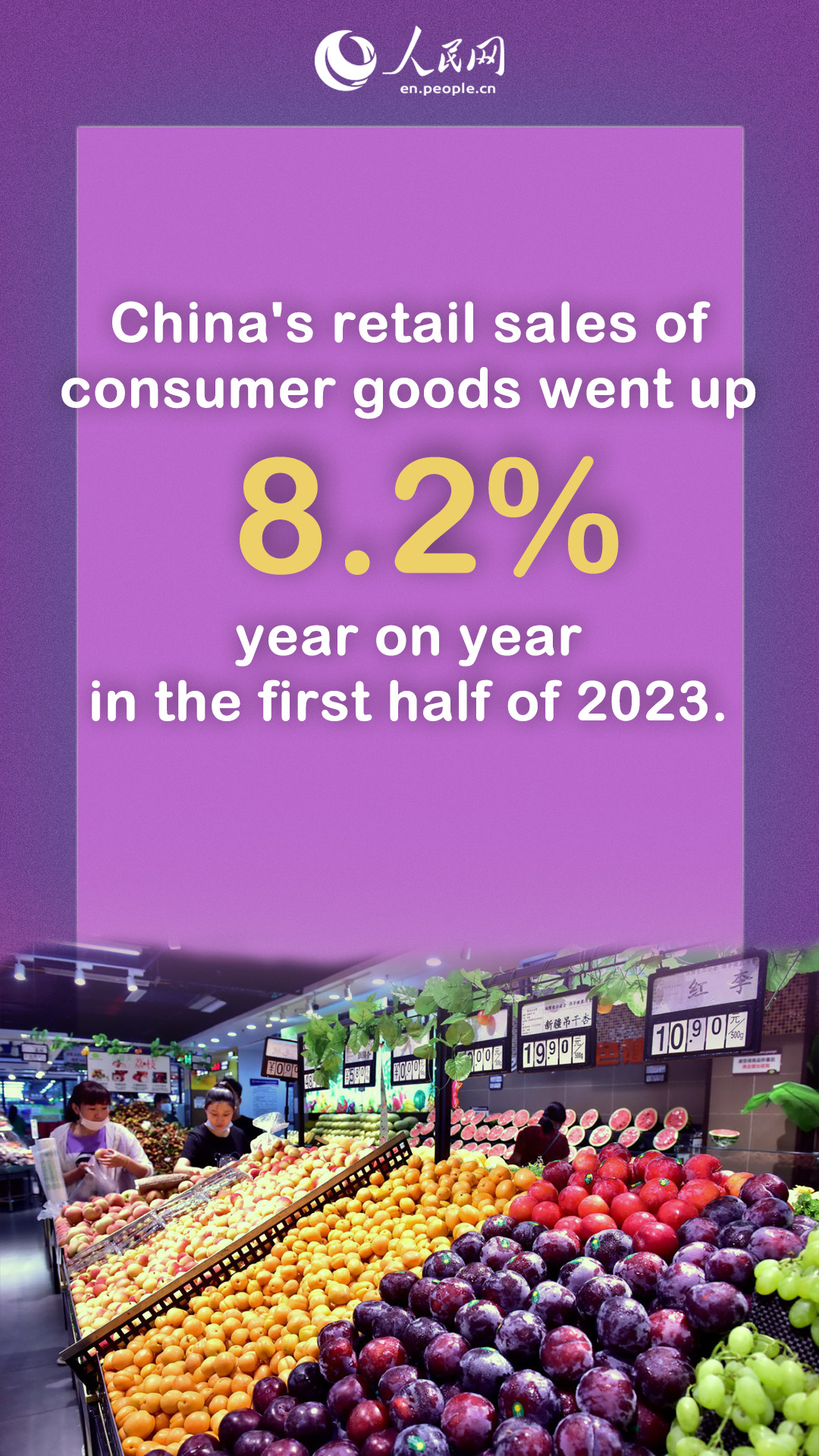 China's retail sales of consumer goods went up 8.2 percent year on year in the first half of 2023.
