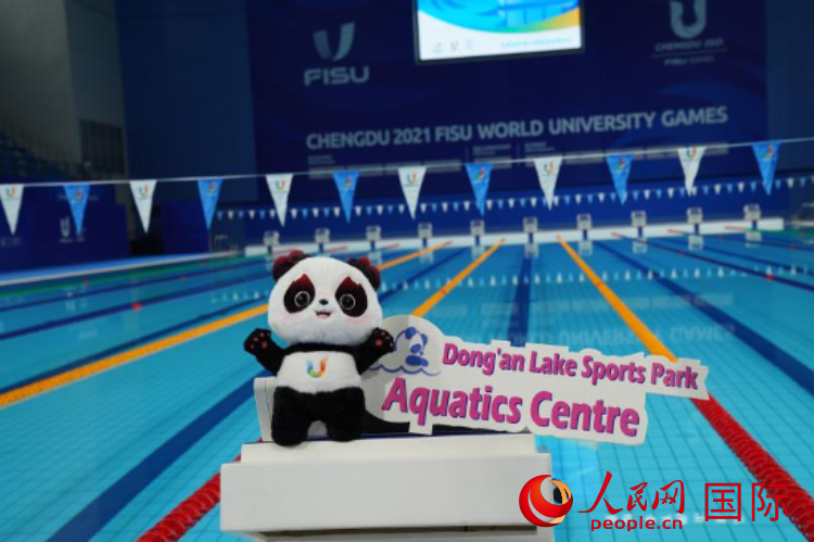 An image shows "Rongbao," the mascot for the University Games, at Dong'an Lake Sports Park Aquatics Center. (People's Daily Online/Zhou Linjia)