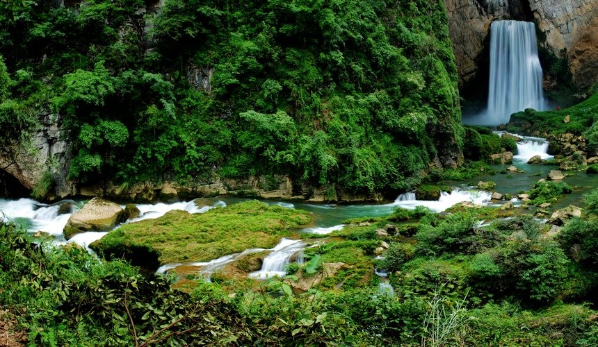 The waterfall at Yangpi Cave in the Anliu River scenic area in Qingzhen city, southwest China's Guizhou Province. (Photo/Duan Biao)