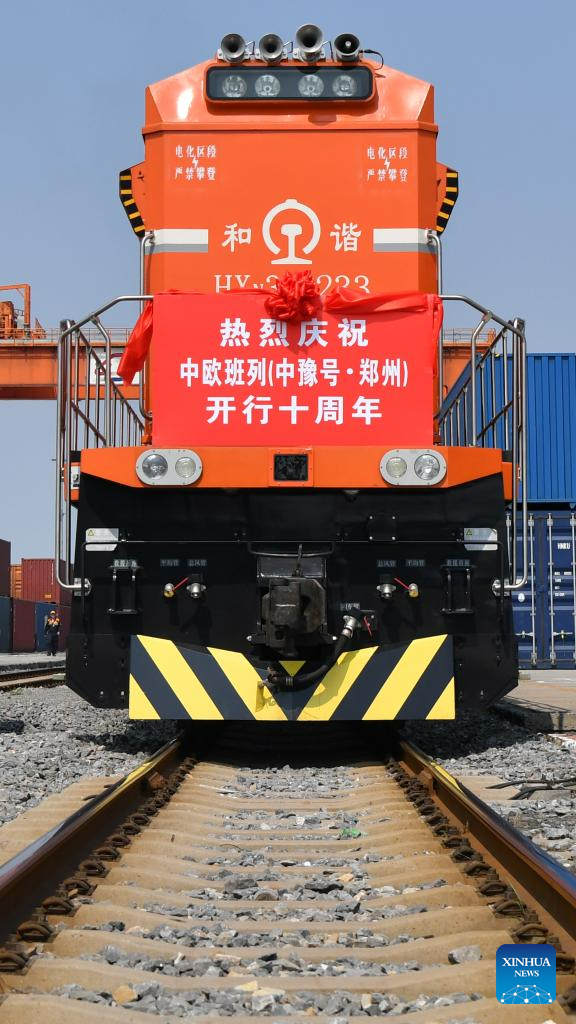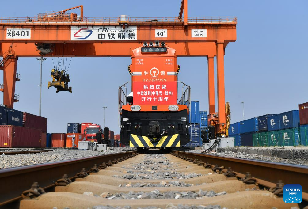 A China-Europe freight train bound for Hamburg, Germany waits for departure at Putian Station in Zhengzhou, capital of central China's Henan Province, July 18, 2023. Zhengzhou has handled 7,572 China-Europe freight trains which have carried 670,000 twenty-foot equivalent units (TEUs) of cargo since July 18, 2013. (Xinhua/Lu Peng)