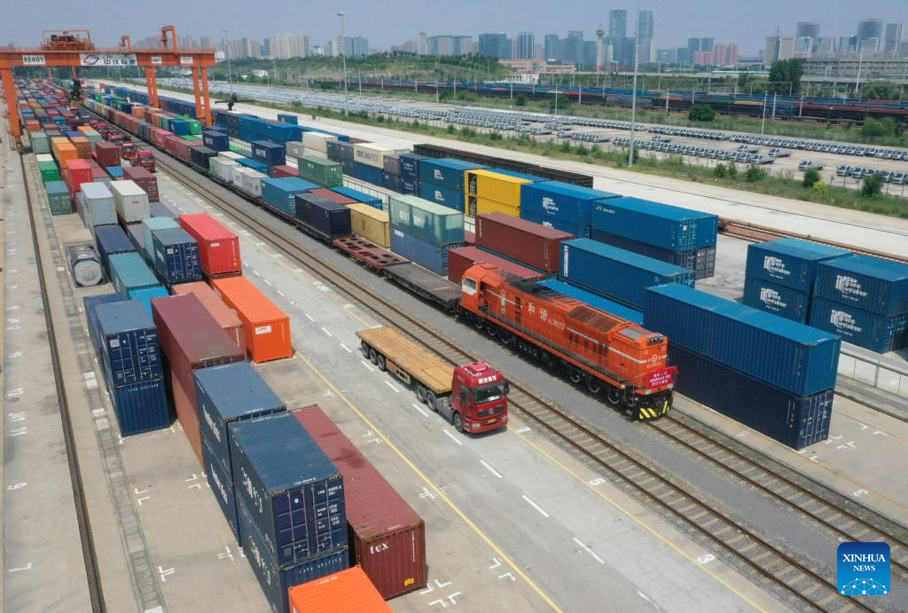 This aerial photo taken on July 18, 2023 shows a China-Europe freight train bound for Hamburg, Germany leaving Putian Station in Zhengzhou, capital of central China's Henan Province. Zhengzhou has handled 7,572 China-Europe freight trains which have carried 670,000 twenty-foot equivalent units (TEUs) of cargo since July 18, 2013. (Xinhua/Li Jianan)