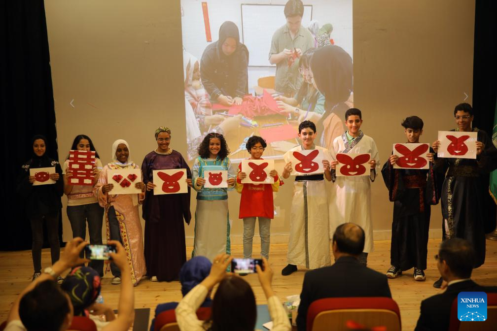 Students show their paper cutting works at the closing ceremony of the first Chinese language summer camp in Cairo, Egypt, on July 18, 2023. More than 100 students from Egyptian governmental preparatory schools celebrated on Tuesday the conclusion of their first Chinese language summer camp. (Xinhua/Ahmed Gomaa)