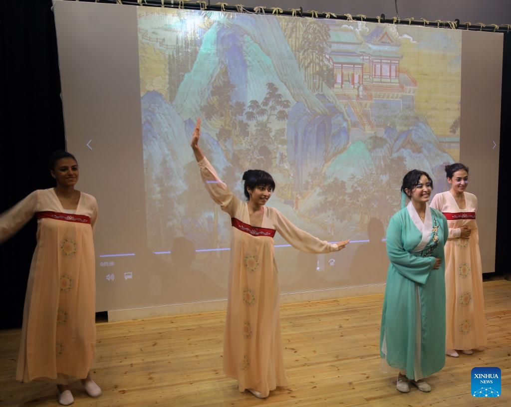 Students perform a traditional Chinese dance at the closing ceremony of the first Chinese language summer camp in Cairo, Egypt, on July 18, 2023. More than 100 students from Egyptian governmental preparatory schools celebrated on Tuesday the conclusion of their first Chinese language summer camp. (Xinhua/Ahmed Gomaa)
