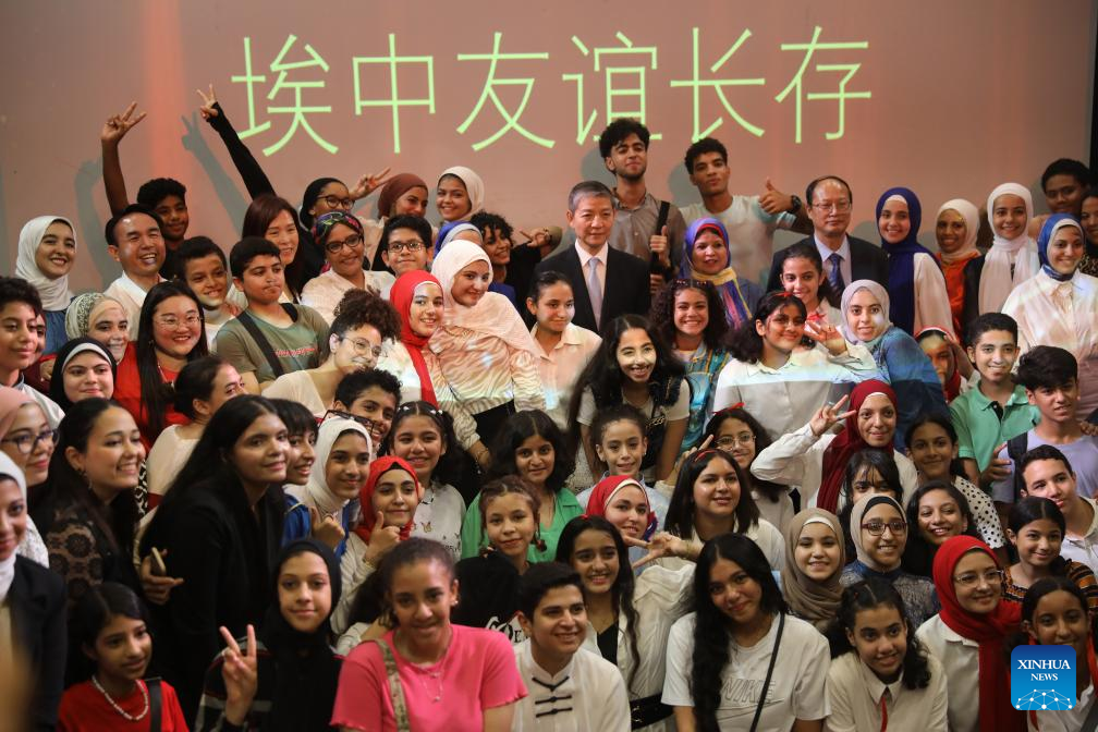 People pose for photos at the closing ceremony of the first Chinese language summer camp in Cairo, Egypt, on July 18, 2023. More than 100 students from Egyptian governmental preparatory schools celebrated on Tuesday the conclusion of their first Chinese language summer camp. (Xinhua/Ahmed Gomaa)