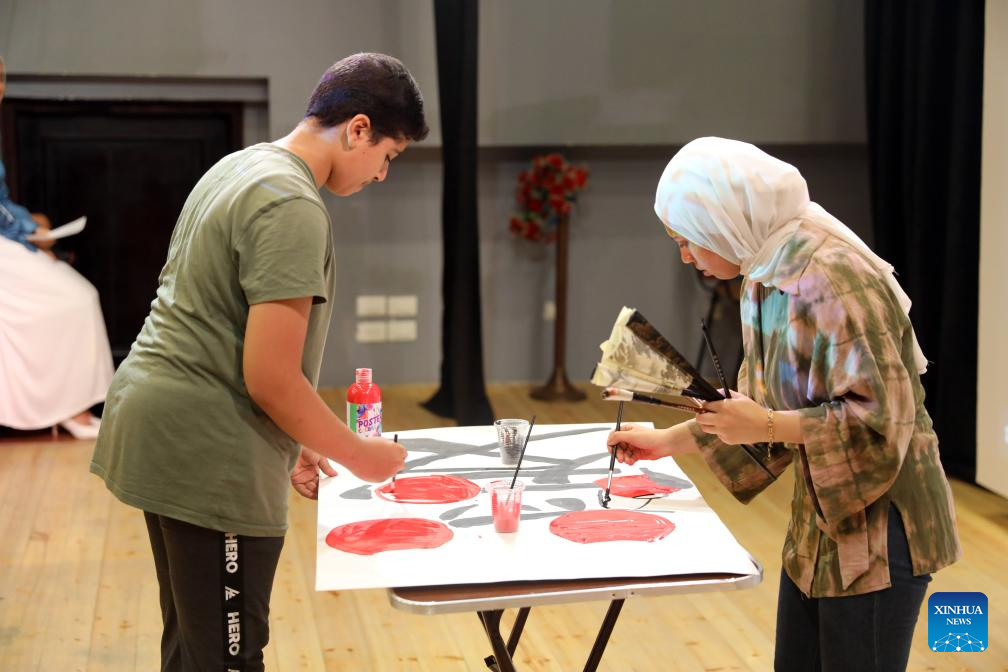 Students show their painting skills at the closing ceremony of the first Chinese language summer camp in Cairo, Egypt, on July 18, 2023. More than 100 students from Egyptian governmental preparatory schools celebrated on Tuesday the conclusion of their first Chinese language summer camp. (Xinhua/Ahmed Gomaa)