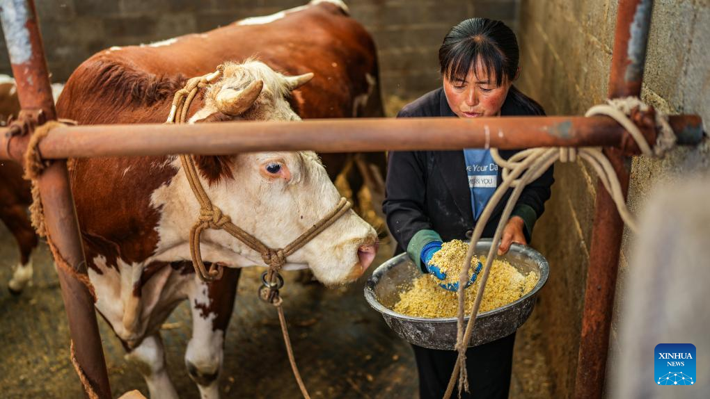 Farmer Wen Hui feeds a head of cattle at her own barn in Xueshan Town of Weining Yi, Hui and Miao Autonomous County in southwest China's Guizhou Province, July 13, 2023. The county has promoted the development of animal husbandry industry in recent years. Farmers here run family ranches to achieve stable yield and increasing income. (Xinhua/Tao Liang)
