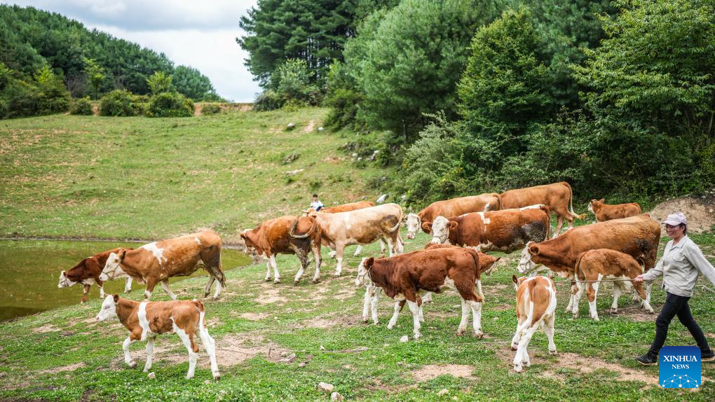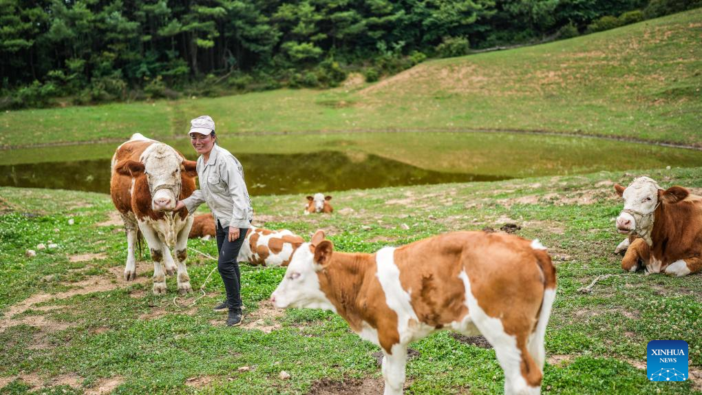 Farmer Song Hongmei herds cattle near her house in Xueshan Town of Weining Yi, Hui and Miao Autonomous County in southwest China's Guizhou Province, July 13, 2023 The county has promoted the development of animal husbandry industry in recent years. Farmers here run family ranches to achieve stable yield and increasing income. (Xinhua/Tao Liang)