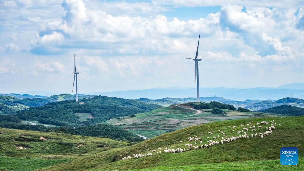 This aerial photo taken on July 13, 2023 shows sheep grazing on a grassland under wind power turbines in Xueshan Town of Weining Yi, Hui and Miao Autonomous County in southwest China's Guizhou Province. The county has promoted the development of animal husbandry industry in recent years. Farmers here run family ranches to achieve stable yield and increasing income. (Xinhua/Tao Liang)