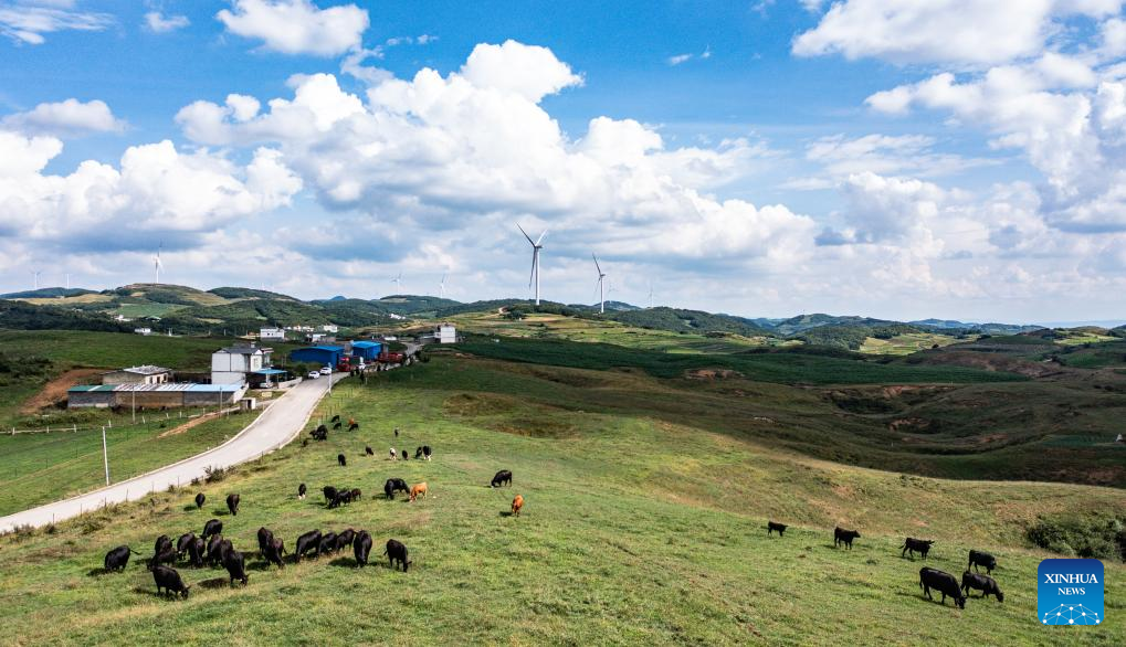 This aerial photo taken on July 13, 2023 shows cattle grazing on a grassland under wind power turbines in Xueshan Town of Weining Yi, Hui and Miao Autonomous County in southwest China's Guizhou Province. The county has promoted the development of animal husbandry industry in recent years. Farmers here run family ranches to achieve stable yield and increasing income. (Xinhua/Tao Liang)