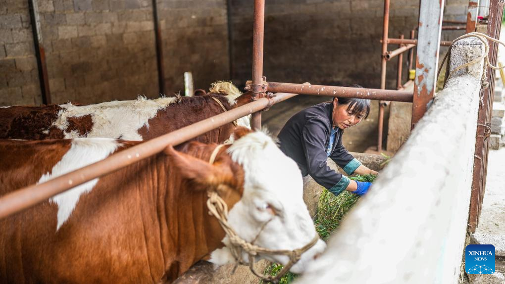 Farmer Wen Hui feeds cattle at her own barn in Xueshan Town of Weining Yi, Hui and Miao Autonomous County in southwest China's Guizhou Province, July 13, 2023. The county has promoted the development of animal husbandry industry in recent years. Farmers here run family ranches to achieve stable yield and increasing income. (Xinhua/Tao Liang)