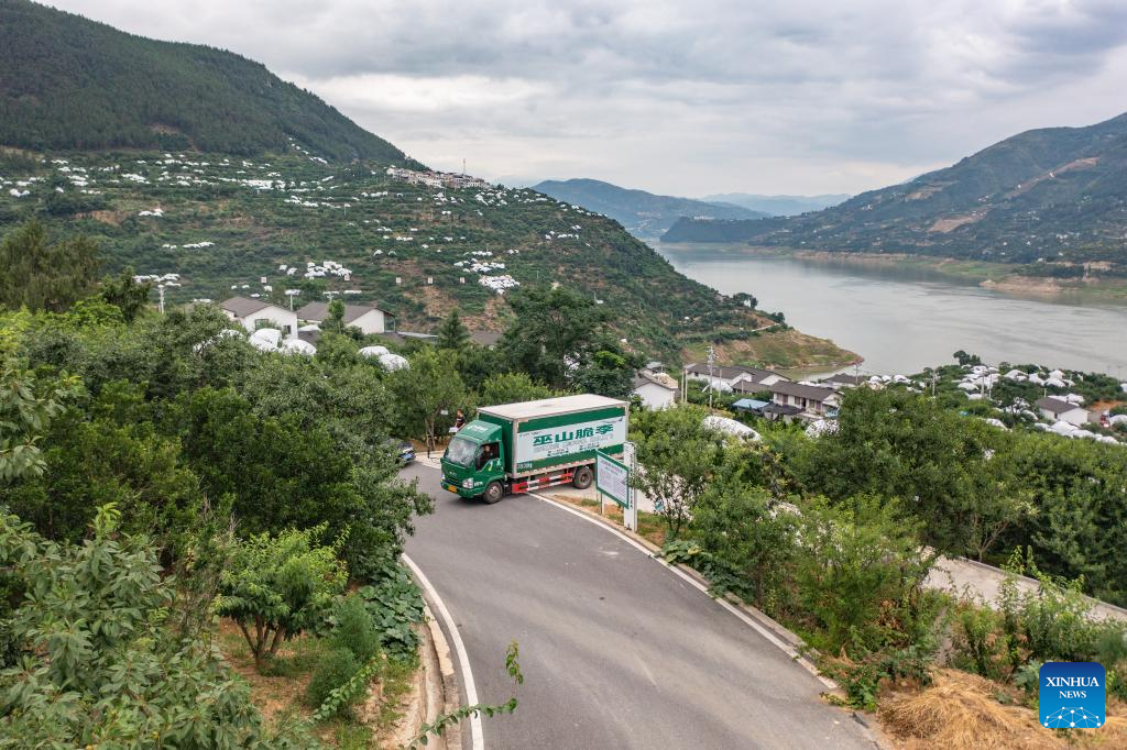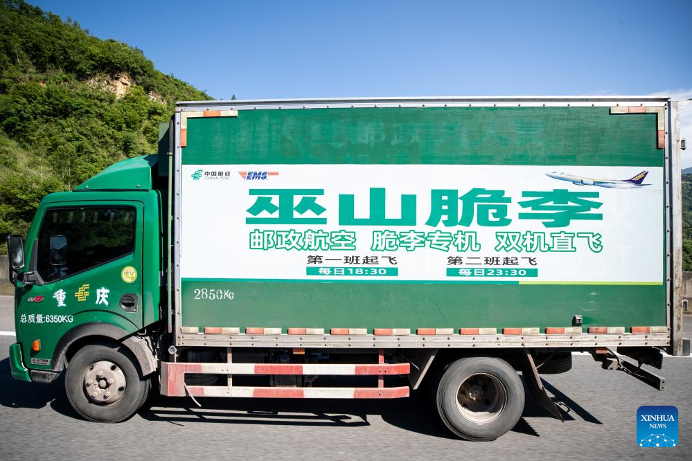 This photo taken on June 30, 2023 shows a truck loaded with crisp plums on an expressway in Wushan County, southwest China's Chongqing. Known for its crisp, juicy and tender flesh, the crisp plum is one of the major fruits grown in Wushan County, playing a vital role in boosting rural revitalization. The improvement of logistics and delivery service have contributed to the sales of the dainty fruit across the country. (Xinhua/Chu Jiayin)