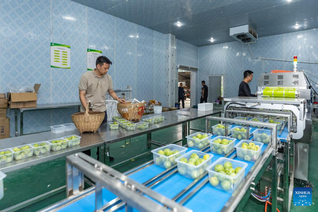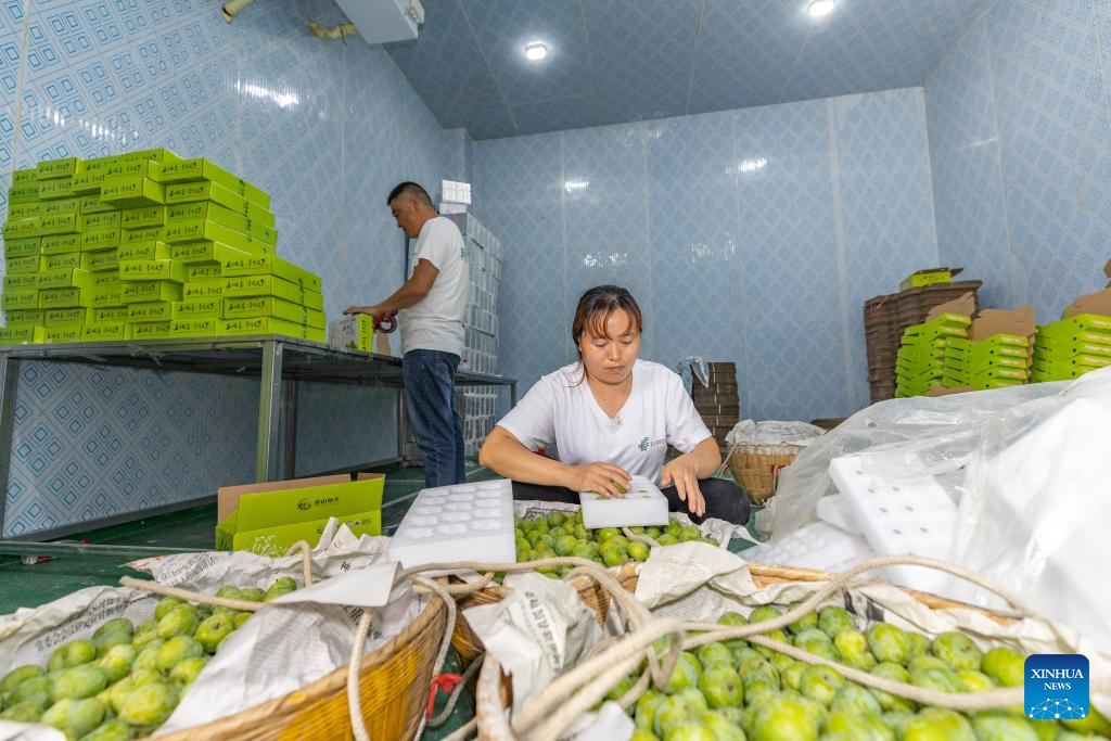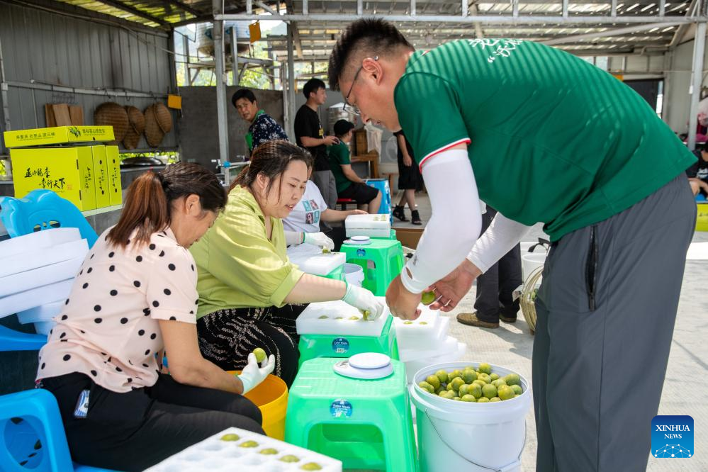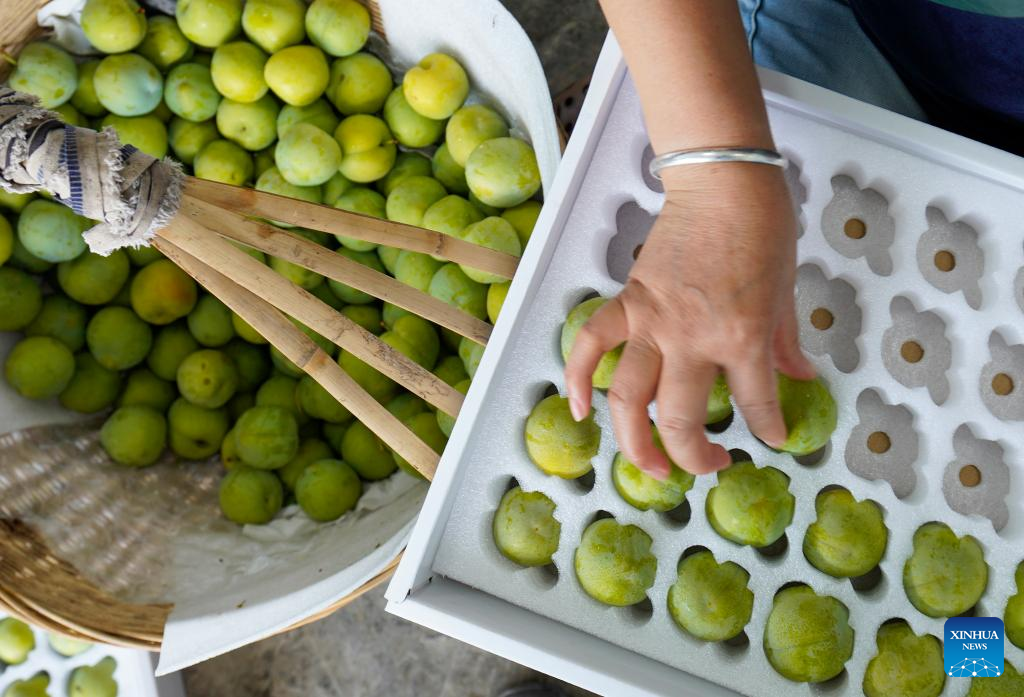 A farmer packages crisp plums at a plantation in Wenfeng Village of Wushan County, southwest China's Chongqing, June 29, 2023. Known for its crisp, juicy and tender flesh, the crisp plum is one of the major fruits grown in Wushan County, playing a vital role in boosting rural revitalization. The improvement of logistics and delivery service have contributed to the sales of the dainty fruit across the country. (Xinhua/Liu Chan)
