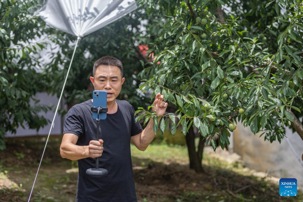 A man sells crisp plums via livestreaming at Ganyuan Village of Wushan County, southwest China's Chongqing, June 30, 2023. Known for its crisp, juicy and tender flesh, the crisp plum is one of the major fruits grown in Wushan County, playing a vital role in boosting rural revitalization. The improvement of logistics and delivery service have contributed to the sales of the dainty fruit across the country. (Xinhua/Huang Wei)