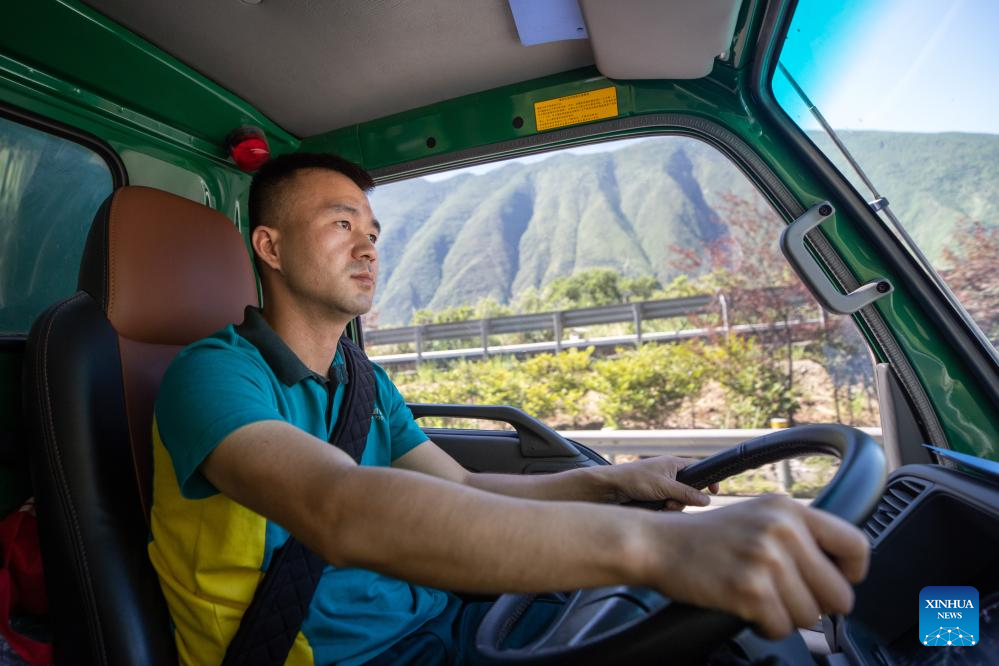 A staff member drives a truck loaded with crisp plums on an expressway in Wushan County, southwest China's Chongqing, June 30, 2023. Known for its crisp, juicy and tender flesh, the crisp plum is one of the major fruits grown in Wushan County, playing a vital role in boosting rural revitalization. The improvement of logistics and delivery service have contributed to the sales of the dainty fruit across the country. (Xinhua/Chu Jiayin)