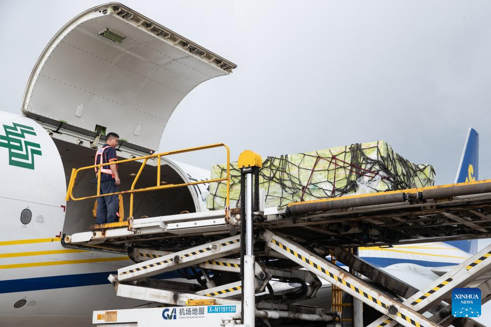 Staff members load crisp plums onto a cargo airplane at Wushan Airport in southwest China's Chongqing, June 28, 2023. Known for its crisp, juicy and tender flesh, the crisp plum is one of the major fruits grown in Wushan County, playing a vital role in boosting rural revitalization. The improvement of logistics and delivery service have contributed to the sales of the dainty fruit across the country. (Xinhua/Liu Chan)