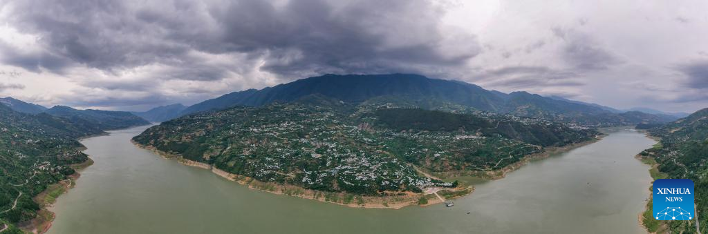 This aerial panorama photo taken on June 28, 2023 at Quchi Township in Wushan County, southwest China's Chongqing, shows a crisp plum planting base along the Yangtze River. Known for its crisp, juicy and tender flesh, the crisp plum is one of the major fruits grown in Wushan County, playing a vital role in boosting rural revitalization. The improvement of logistics and delivery service have contributed to the sales of the dainty fruit across the country. (Xinhua/Huang Wei)