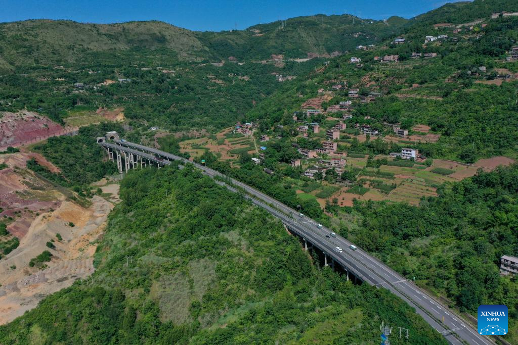 This aerial photo taken on June 30, 2023 shows trucks loaded with crisp plums running on an expressway in Wushan County, southwest China's Chongqing. Known for its crisp, juicy and tender flesh, the crisp plum is one of the major fruits grown in Wushan County, playing a vital role in boosting rural revitalization. The improvement of logistics and delivery service have contributed to the sales of the dainty fruit across the country. (Xinhua/Liu Chan)