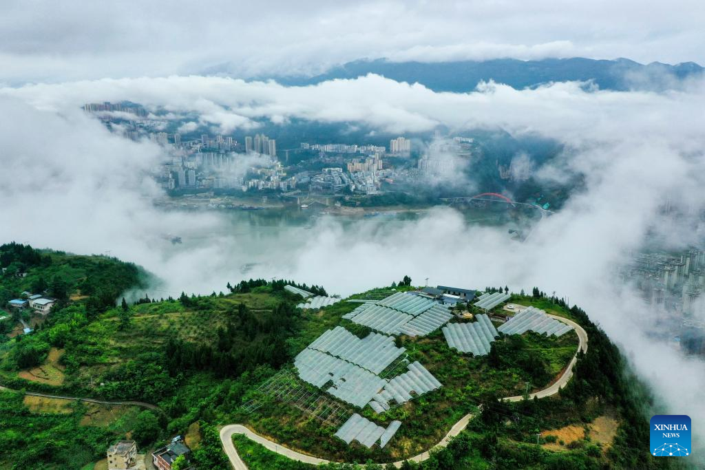 This aerial photo taken on June 29, 2023 shows a crisp plum plantation at Wenfeng Village in Wushan County, southwest China's Chongqing. Known for its crisp, juicy and tender flesh, the crisp plum is one of the major fruits grown in Wushan County, playing a vital role in boosting rural revitalization. The improvement of logistics and delivery service have contributed to the sales of the dainty fruit across the country. (Xinhua/Liu Chan)