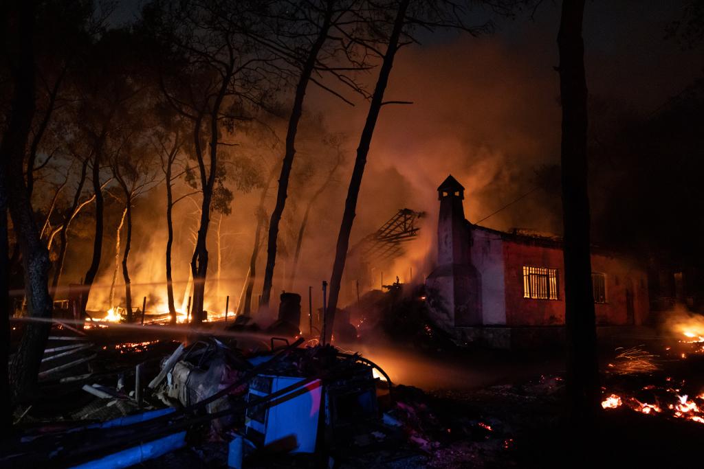 This photo taken on July 18, 2023 shows a burning house following a wildfire in Mandra, a western suburb of Athens, Greece. (Photo by Lefteris Partsalis/Xinhua)