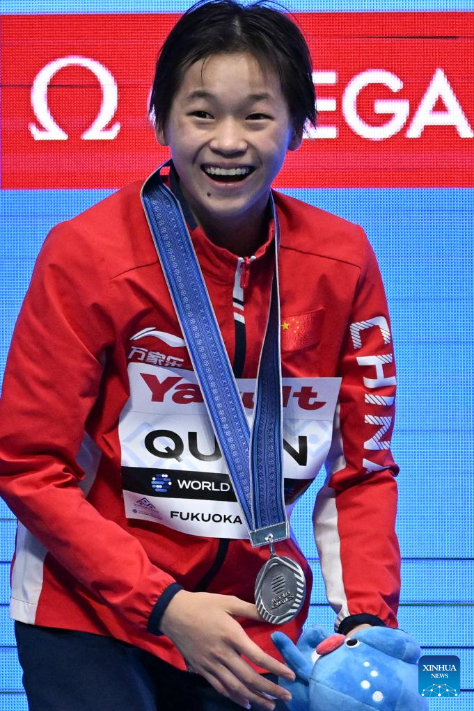 Quan Hongchan of China reacts during the awarding ceremony of women's 10m platform final of the World Aquatics Championships 2023 in Fukuoka, Japan, July 19, 2023. (Xinhua/Xu Chang)