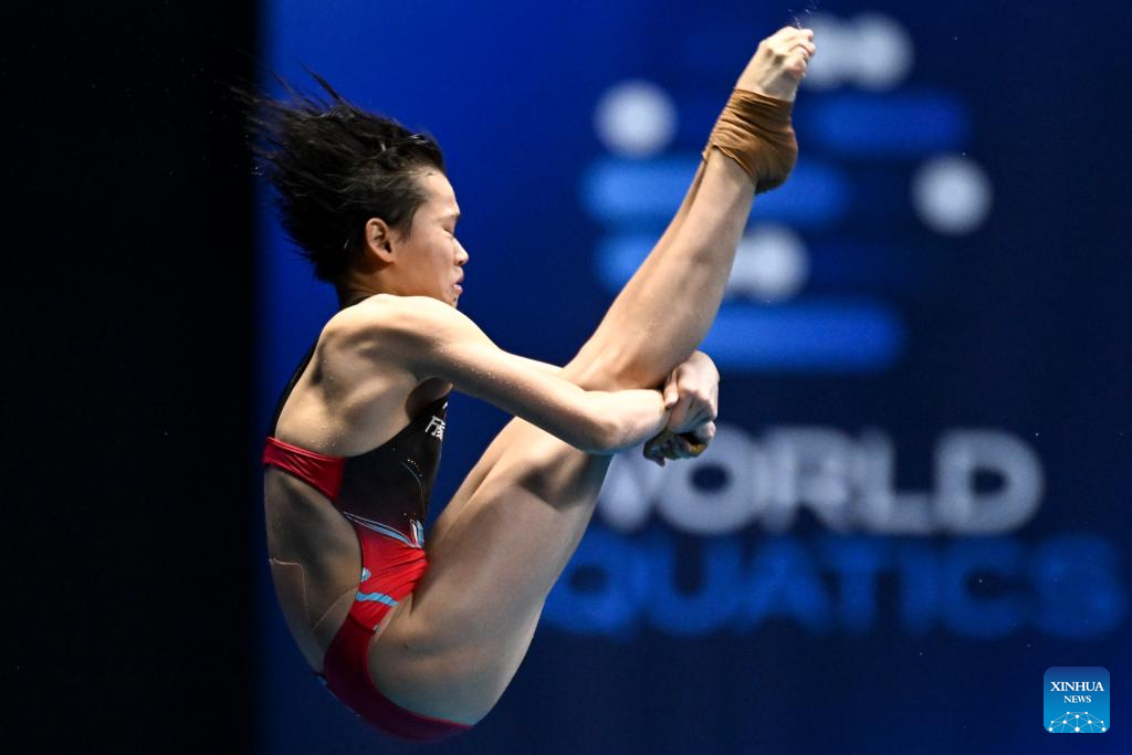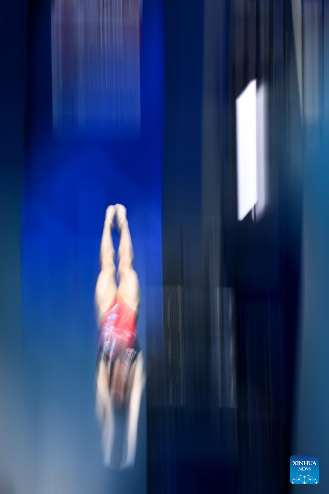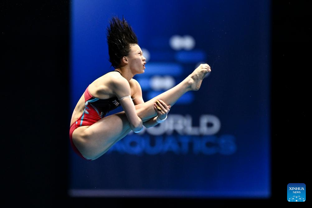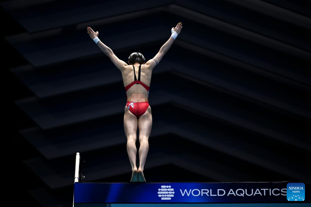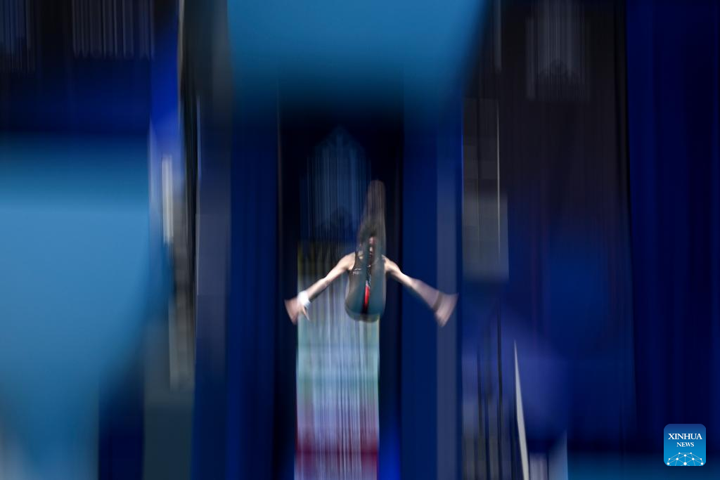 Quan Hongchan of China competes during the women's 10m platform final of the World Aquatics Championships 2023 in Fukuoka, Japan, July 19, 2023. (Xinhua/Xu Chang)