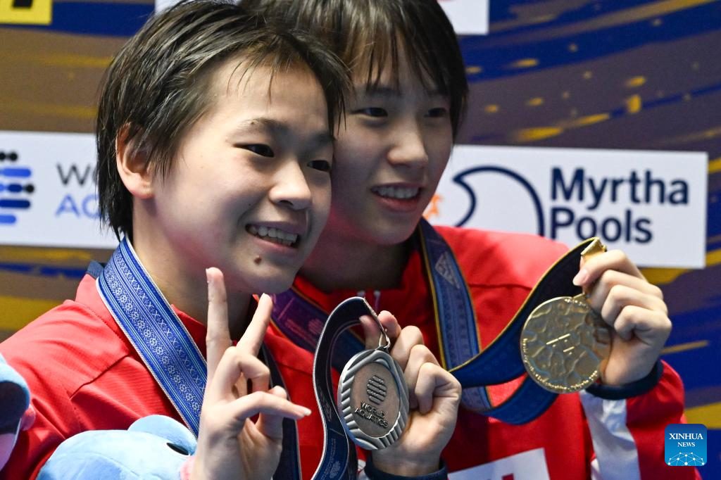 Gold medalist Chen Yuxi (R) of China and silver medalist Quan Hongchan of China pose during the awarding ceremony of women's 10m platform final of the World Aquatics Championships 2023 in Fukuoka, Japan, July 19, 2023. (Xinhua/Xu Chang)