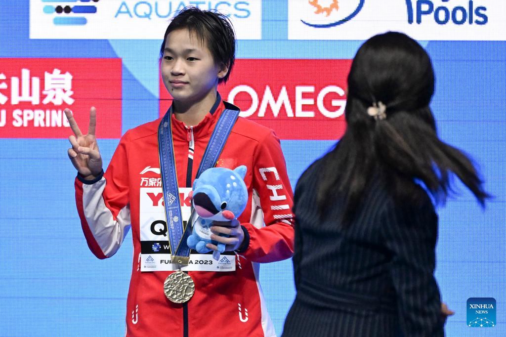 Quan Hongchan of China poses during the awarding ceremony of women's 10m platform final of the World Aquatics Championships 2023 in Fukuoka, Japan, July 19, 2023. (Xinhua/Xu Chang)