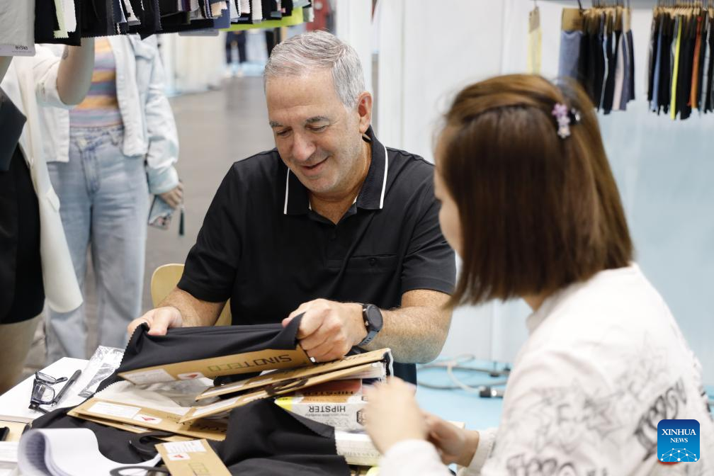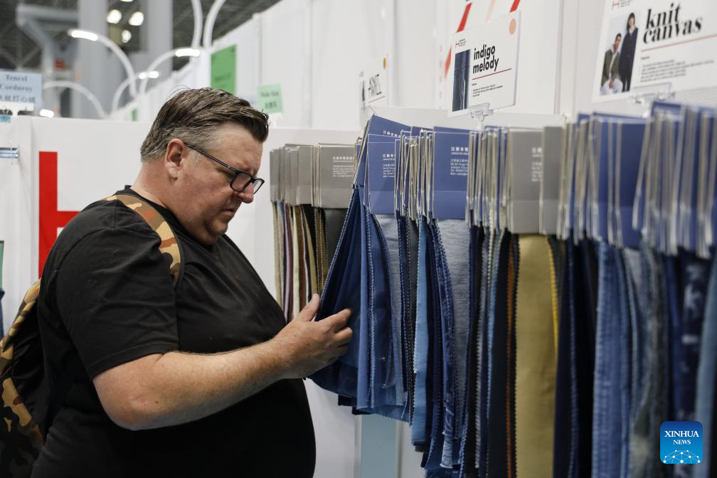 A client selects fabric at a booth of an enterprise from China's Jiangyin during the 24th China Textile and Apparel Trade Show in New York, the United States, on July 19, 2023. The 24th China Textile and Apparel Trade Show kicked off at the Javits Center, Manhattan, New York City on Tuesday. The three-day event, held in parallel with Texworld New York, Apparel Sourcing New York, and Home Textile Sourcing Expo, gathered nearly 800 Chinese fabric, home textile, and apparel manufacturers to showcase their latest products and collections to their American fashion clients. (Xinhua/Xie E)