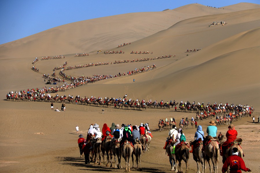 Tourists at the Mingsha Mountain and Crescent Spring scenic spot in Dunhuang city, northwest China's Gansu Province, during the summer vacation. (Photo/Zhang Xiaoliang)