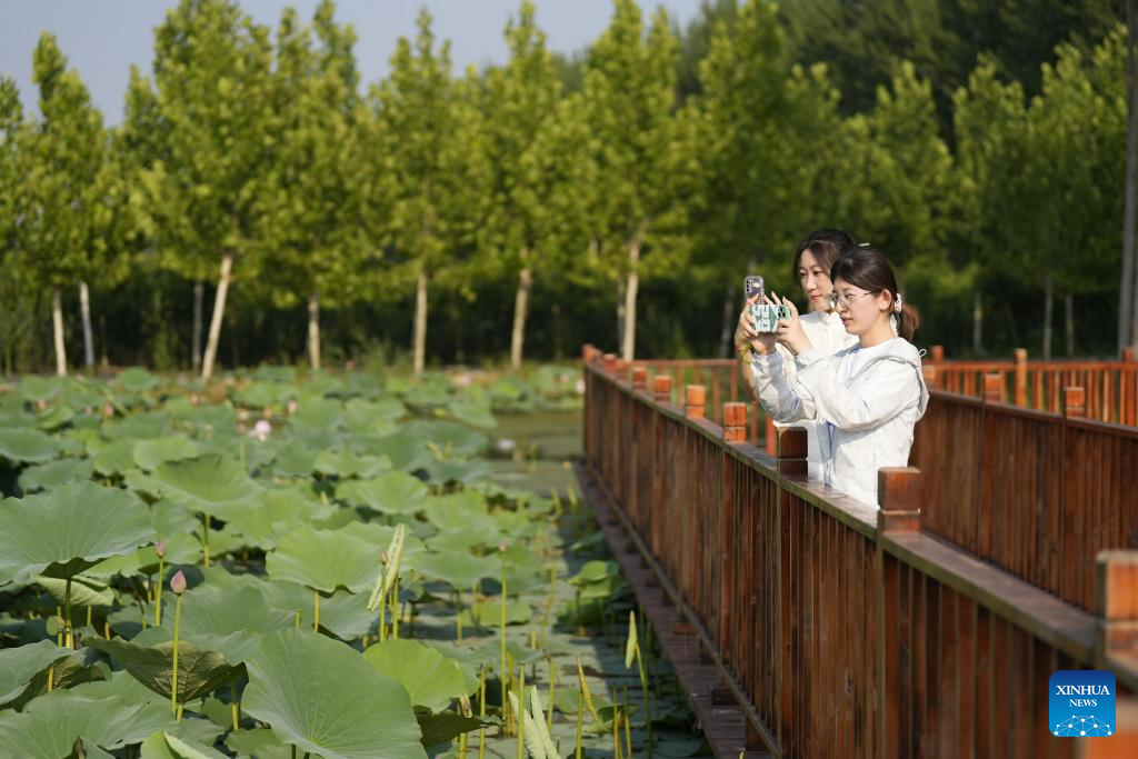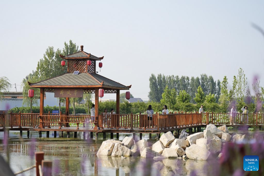 People take photos at a park in Beisunzhuang Village, Fengnan District, Tangshan City, north China's Hebei Province, July 19, 2023. Fengnan District has made great efforts in improving rural living environment in recent years. With the upgrading of local public infrastructure and services, rural tourism here has increased villagers' income, injecting momentum and vitality into rural revitalization. (Xinhua/Mu Yu)