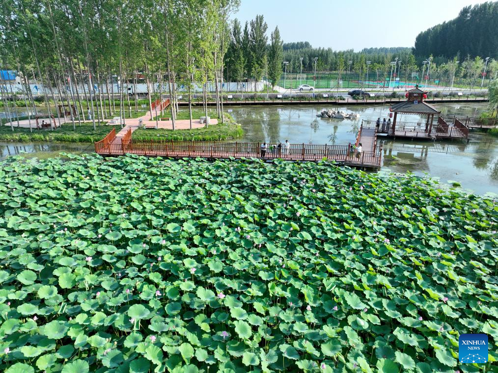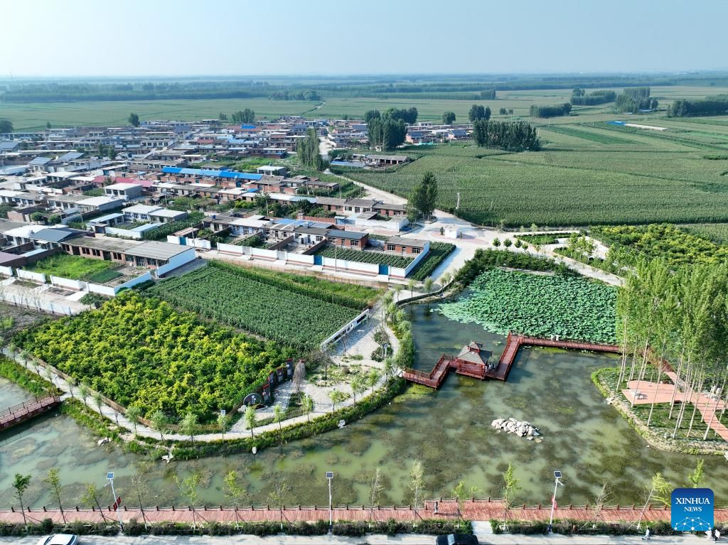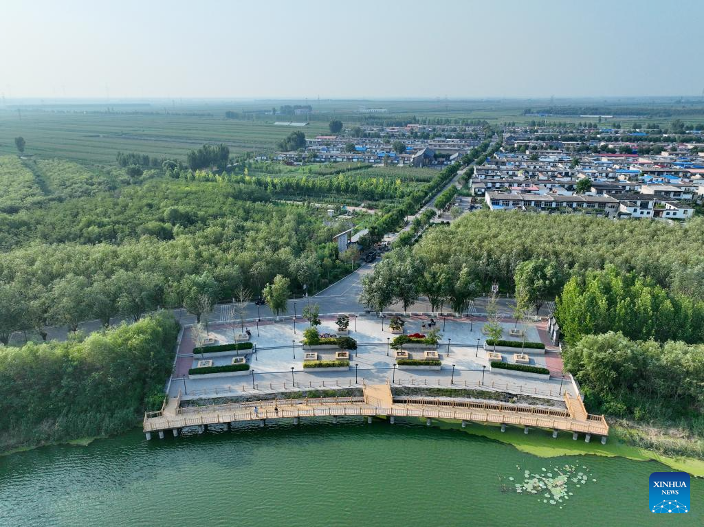 This aerial photo taken on July 19, 2023 shows the scenery of a park at Beisunzhuang Village in Fengnan District of Tangshan City, north China's Hebei Province. Fengnan District has made great efforts in improving rural living environment in recent years. With the upgrading of local public infrastructure and services, rural tourism here has increased villagers' income, injecting momentum and vitality into rural revitalization. (Xinhua/Mu Yu)