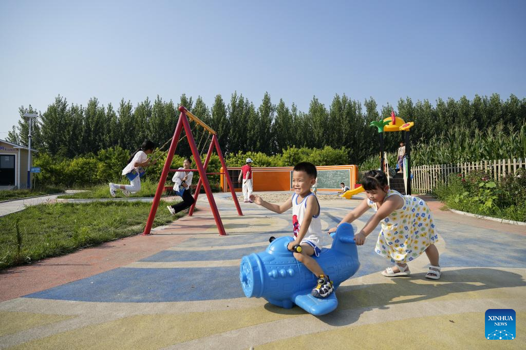 Children play at a park in Zhaoxinzhuang Village, Fengnan District, Tangshan City, north China's Hebei Province, July 19, 2023. Fengnan District has made great efforts in improving rural living environment in recent years. With the upgrading of local public infrastructure and services, rural tourism here has increased villagers' income, injecting momentum and vitality into rural revitalization. (Xinhua/Mu Yu)