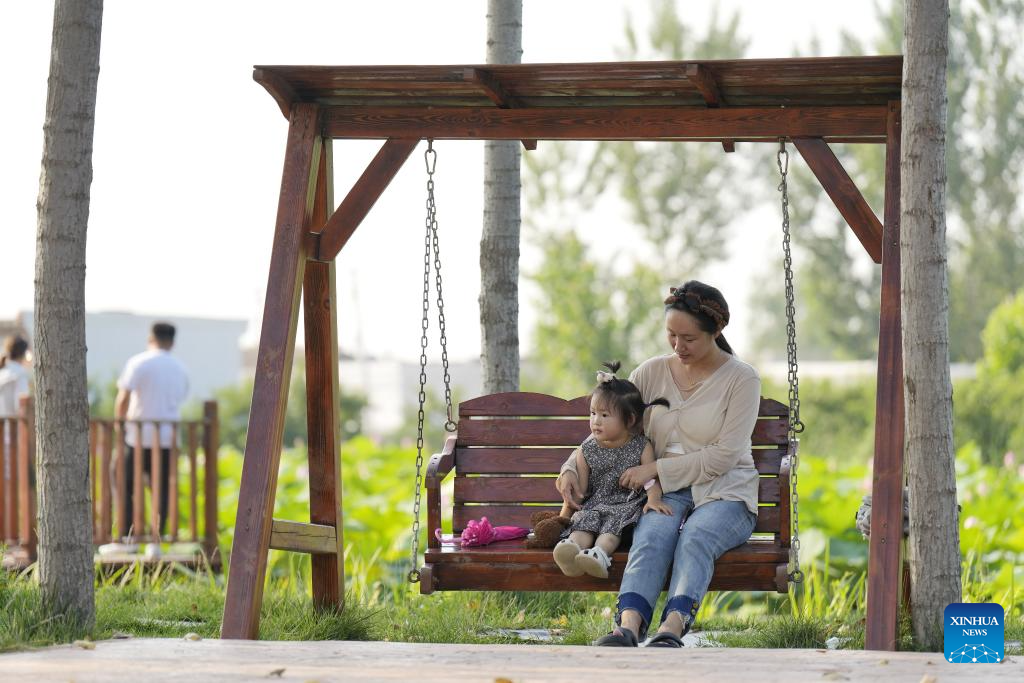 People enjoy themselves at a park in Beisunzhuang Village, Fengnan District, Tangshan City, north China's Hebei Province, July 19, 2023. Fengnan District has made great efforts in improving rural living environment in recent years. With the upgrading of local public infrastructure and services, rural tourism here has increased villagers' income, injecting momentum and vitality into rural revitalization. (Xinhua/Mu Yu)
