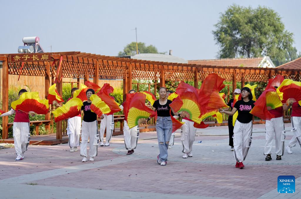 People dance at a park in Zhaoxinzhuang Village, Fengnan District, Tangshan City, north China's Hebei Province, July 19, 2023. Fengnan District has made great efforts in improving rural living environment in recent years. With the upgrading of local public infrastructure and services, rural tourism here has increased villagers' income, injecting momentum and vitality into rural revitalization. (Xinhua/Mu Yu)