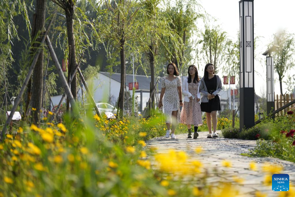 People visit a park at Beisunzhuang Village in Fengnan District of Tangshan City, north China's Hebei Province, July 19, 2023. Fengnan District has made great efforts in improving rural living environment in recent years. With the upgrading of local public infrastructure and services, rural tourism here has increased villagers' income, injecting momentum and vitality into rural revitalization. (Xinhua/Mu Yu)