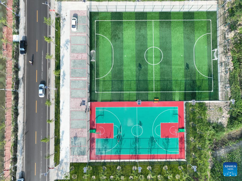 This aerial photo taken on July 19, 2023 shows a new football pitch and a new basketball court at Zhaoxinzhuang Village in Fengnan District of Tangshan City, north China's Hebei Province. Fengnan District has made great efforts in improving rural living environment in recent years. With the upgrading of local public infrastructure and services, rural tourism here has increased villagers' income, injecting momentum and vitality into rural revitalization. (Xinhua/Mu Yu)