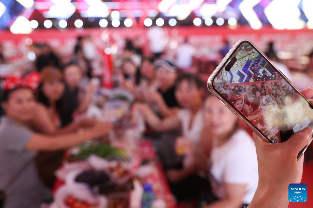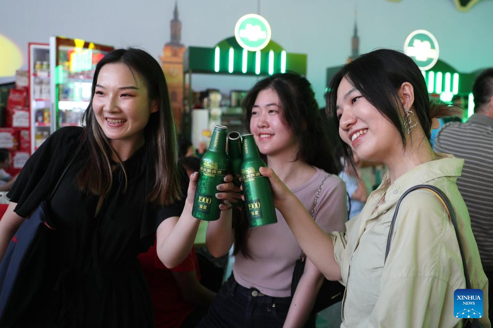 Visitors pose for photos at the 21th China Harbin International Beer Festival in Harbin, capital of northeast China's Heilongjiang Province, July 20, 2023. The 21th China Harbin International Beer Festival opened here on Thursday. (Xinhua/Zhang Tao)