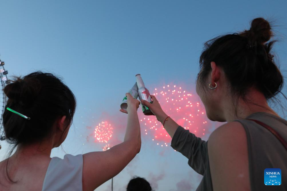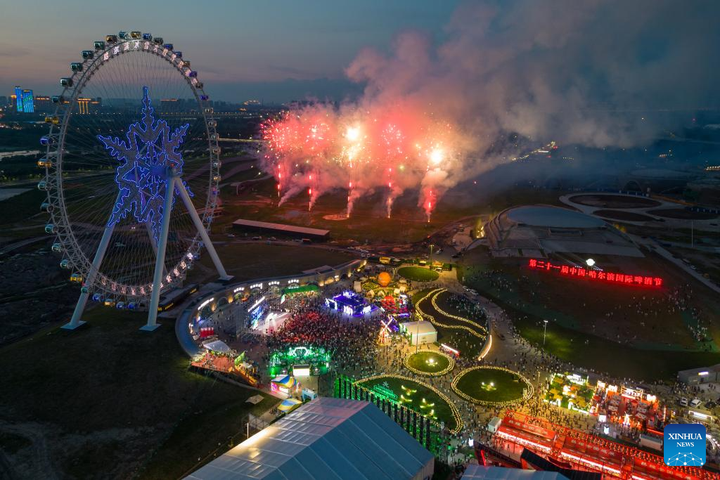 Visitors watch a fireworks show at the 21th China Harbin International Beer Festival in Harbin, capital of northeast China's Heilongjiang Province, July 20, 2023. The 21th China Harbin International Beer Festival opened here on Thursday. (Xinhua/Zhang Tao)