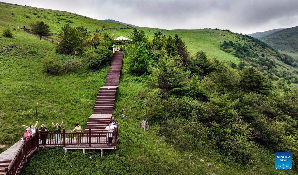 This aerial photo taken on July 19, 2023 shows tourists visiting a scenic spot on Zibai Mountain in Liuba County of northwest China's Shaanxi Province. (Photo by Zhang Lan/Xinhua)
