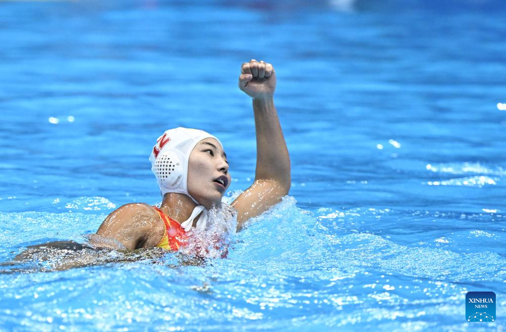 Zhang Jing of China celebrates scoring during the women's water polo preliminary round of Group A match between China and Australia of World Aquatics Championships 2023 held in Fukuoka, Japan, July 20, 2023. (Xinhua/Xia Yifang)