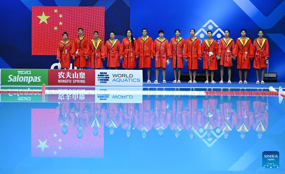 Players of China line up ahead of the women's water polo preliminary round of Group A match between China and Australia of World Aquatics Championships 2023 held in Fukuoka, Japan, July 20, 2023. (Xinhua/Xia Yifang)
