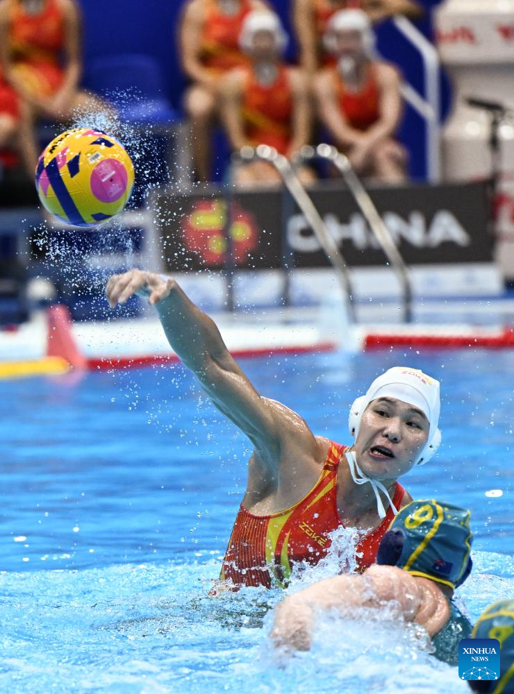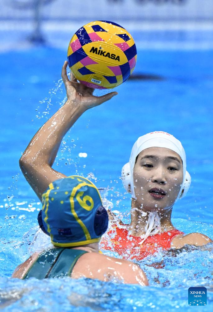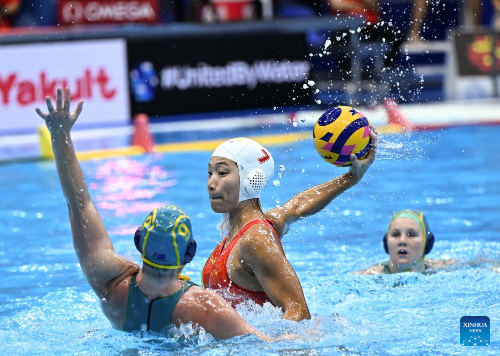 Nong Sanfeng (L) of China competes during the women's water polo preliminary round of Group A match between China and Australia of World Aquatics Championships 2023 held in Fukuoka, Japan, July 20, 2023. (Xinhua/Xia Yifang)