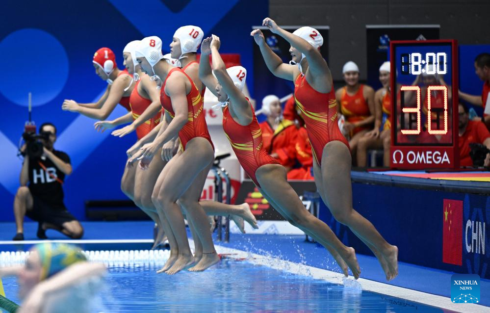 Players of China dive into the water during the women's water polo preliminary round of Group A match between China and Australia of World Aquatics Championships 2023 held in Fukuoka, Japan, July 20, 2023. (Xinhua/Xia Yifang)