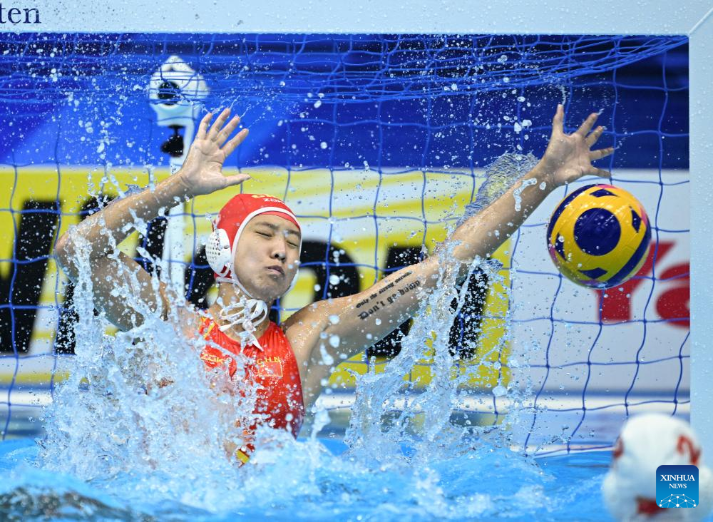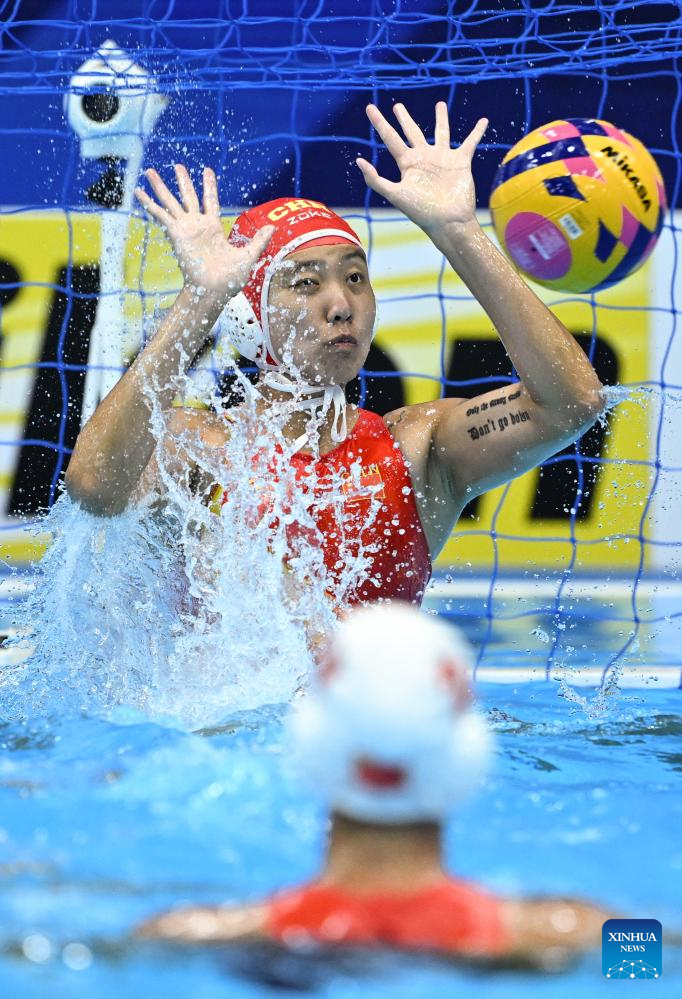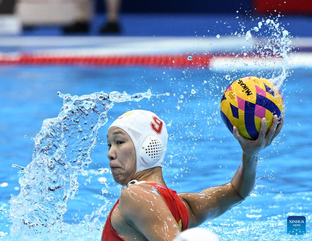 Zhai Ying of China competes during the women's water polo preliminary round of Group A match between China and Australia of World Aquatics Championships 2023 held in Fukuoka, Japan, July 20, 2023. (Xinhua/Xia Yifang)
