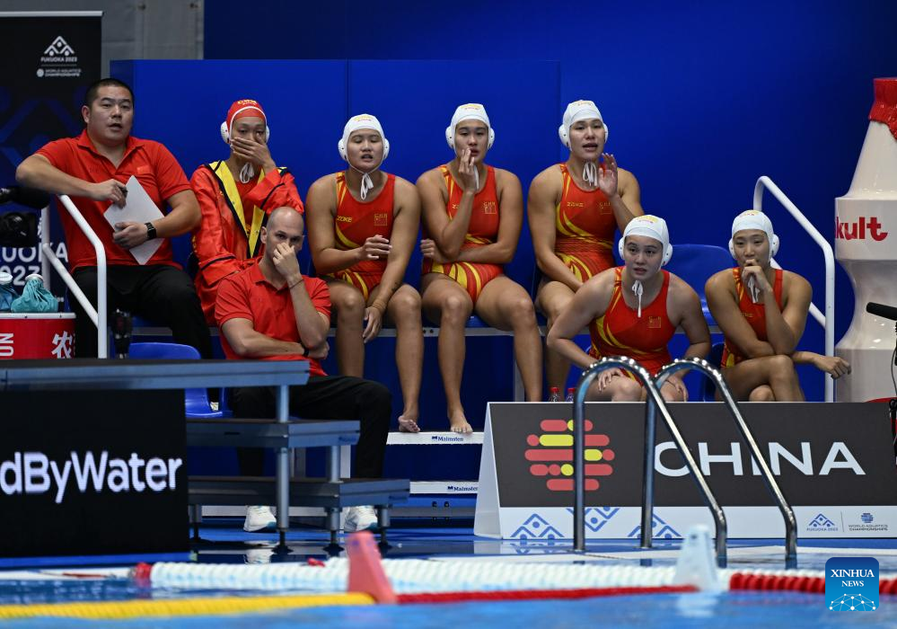Assistant coaches and substitutes of China react during the women's water polo preliminary round of Group A match between China and Australia of World Aquatics Championships 2023 held in Fukuoka, Japan, July 20, 2023. (Xinhua/Xia Yifang)