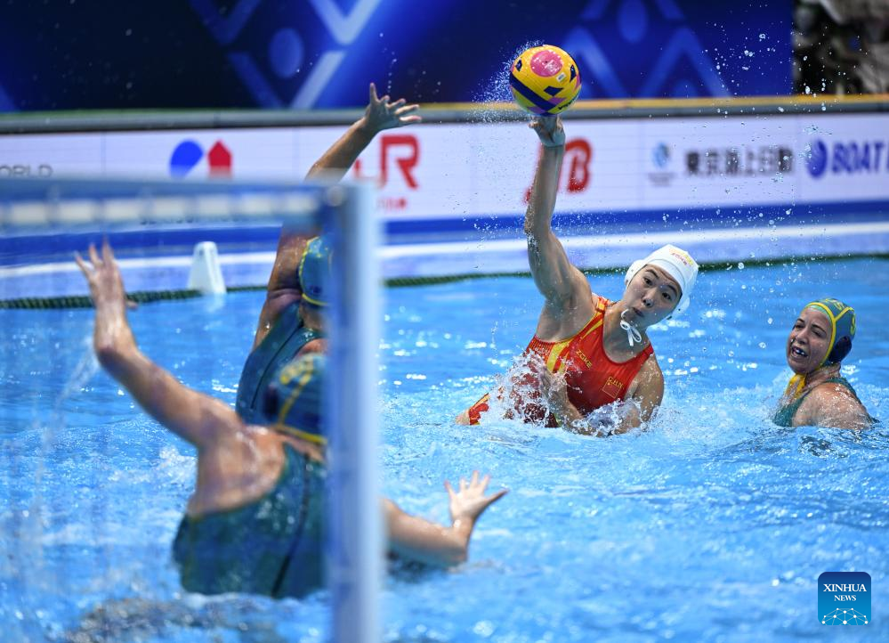 Lu Yiwen (R) of China competes during the women's water polo preliminary round of Group A match between China and Australia of World Aquatics Championships 2023 held in Fukuoka, Japan, July 20, 2023. (Xinhua/Xia Yifang)