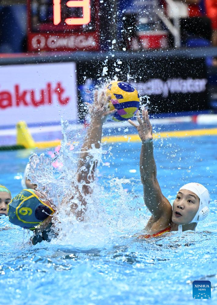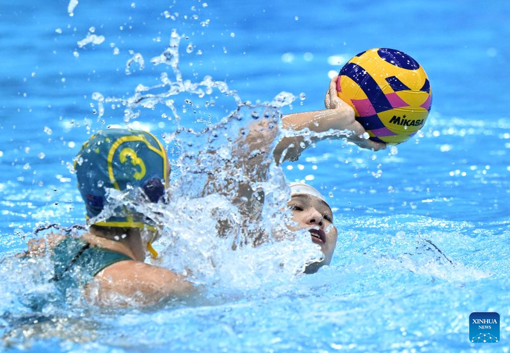 Deng Zewen (R) of China competes during the women's water polo preliminary round of Group A match between China and Australia of World Aquatics Championships 2023 held in Fukuoka, Japan, July 20, 2023. (Xinhua/Xia Yifang)