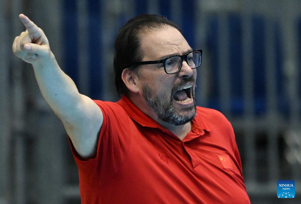 Theocharis Pavlidis, head coach of team China, gives instructions during the women's water polo preliminary round of Group A match between China and Australia of World Aquatics Championships 2023 held in Fukuoka, Japan, July 20, 2023. (Xinhua/Xia Yifang)