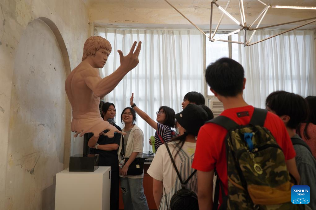 People visit an exhibition commemorating Bruce Lee in Sham Shui Po of Hong Kong, south China, July 19, 2023. (Xinhua/Chu Mengmeng)